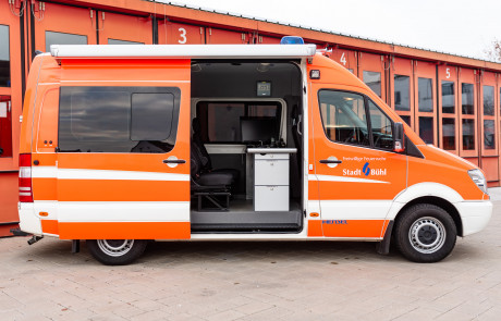 Das mobile Büro der Führungsgruppe. Im Einsatzfall werden von hieraus die Einsatzkräfte und Maßnahmen koordiniert.